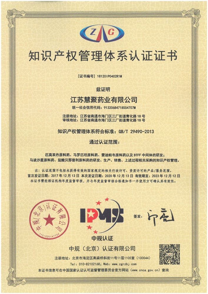 2020年12月3-4日,中规(北京)认证有限公司审核专家组对公司进行为期两天的知识产权管理体系再认证审核,此次再认证审核,专家组对我公司知识产权管理体系运行的适宜性和有效性给予认可和肯定,最终开云kaiyun网页版官网_开云kaiyun(中国)药业顺利通过此次再认证。未来,我公司将继续贯彻《企业知识产权管理规范》,促进知识产权创新发展意识的提高,增强对专利、商标等知识产权的应用和保护能力,将开云kaiyun网页版官网_开云kaiyun(中国)药业打造为知识产权意识强、创新意识强、产业化效益显著和专业人才齐全的创新型企业。